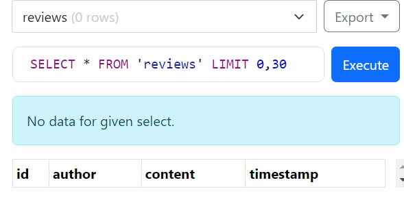 In the above image you can a reviews table which currently has no rows as we haven’t populated it with data.